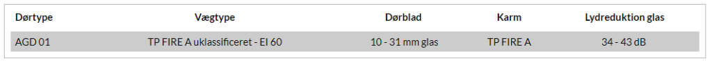Rammeglasdøre kan alternativt monteres i TP FIRE-karme i aluminium og er ligesom stålrammeglasdøren en velegnet dørtype, hvor der er krav til brandmodstandsevne. Døren er designet til montering i glasrammepartierne TP FIRE A med profiler i aluminium.