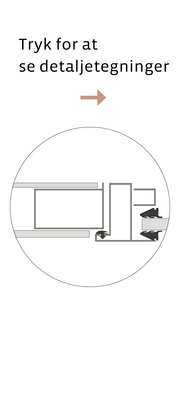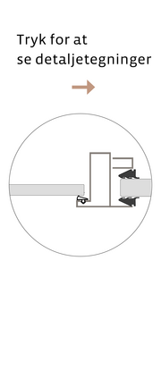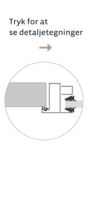 I lukket position er dørbladet fuldstændig integreret, dørkarmene er skjult i sidepanelerne, og der findes ingen synlige skruer. Side- og toppaneler er udført med samme overflade som dørbladet og er demonterbare, så der er mulighed for skjult føring af strømkabler og andre el-installationer.