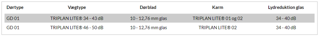 Døre til montage i TRIPLAN LITE® glasvægssystemet monteres i en smal T-formet karm, TRIPLAN LITE® 01-karm, eller i en specielt designet akustik-karm, TRIPLAN LITE® 02-karm, alt efter dørtype. Dørkarmene, som er i aluminium, opfylder krav til både styrke og stabilitet i et minimalistisk design og er nemme at montere på pladsen.
