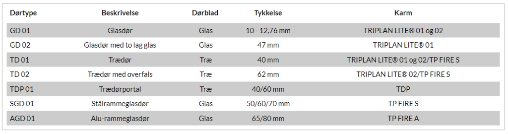Døre kan leveres som enkelt- eller dobbeltfløjede døre med eller uden overglas.
