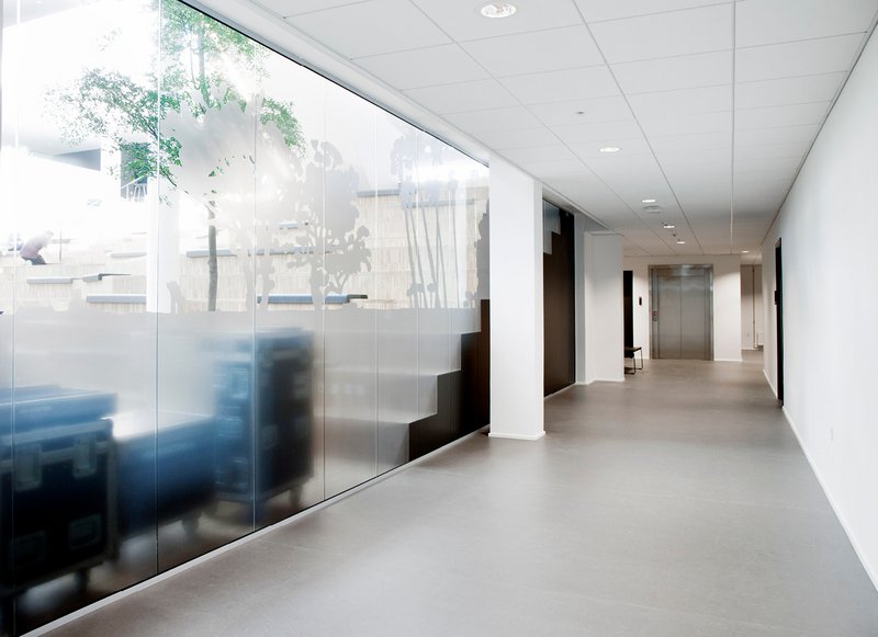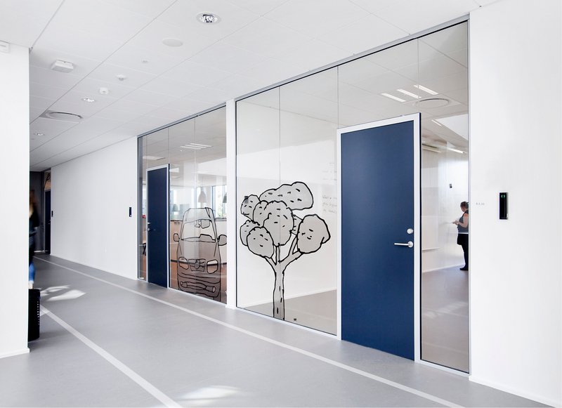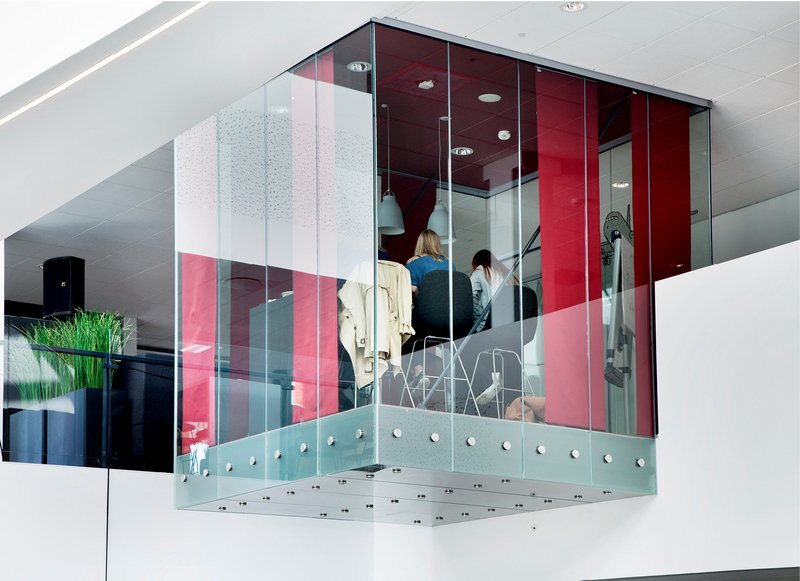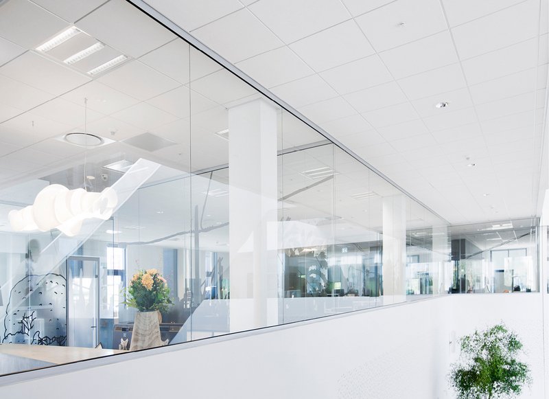 Triplan har leveret TRIPLAN LITE® fuldglasvægge – også til de svævende møderum, som hænger ud over atriet og understreger husets lyse og lette arkitektur. Glasvæggene er udsmykket af kunstneren Søren Behncke med motiver fra byer rundt omkring i verden. I den nederste etage i husets kantine har Triplan leveret en TRIPLAN LITE® glasvæg med glasskydedøre og med adgang til atriet.