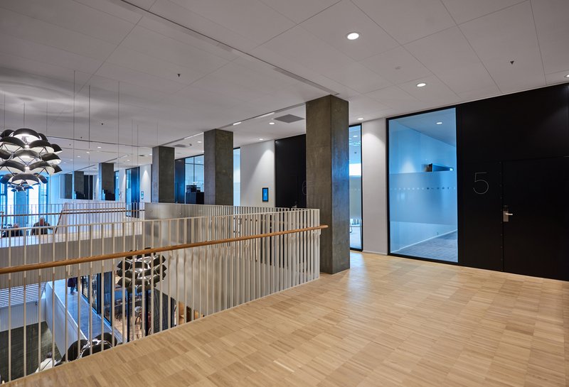 Triplan har leveret glasvægge med sorte profiler, der står i flot kontrast til de øvrige materialer. Glasvæggene er forskellige varianter af TRIPLAN LITE glasvægssystemet, der honorerer høje krav til både brandmodstandsevne og lyddæmpning og understreger den eksklusive arkitektur.