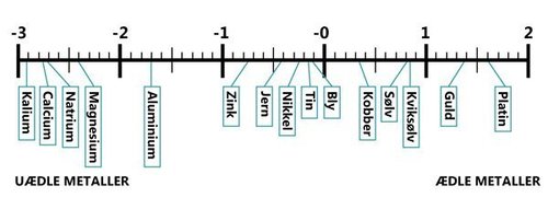 Det galvaniske element dannes pga. spændingsforskel mellem metallerne. Spændingsrækken er en liste over alle metaller, hvor det enkelte metal er anbragt i rækkefølge efter hvor villigt, det er til at indgå i kemiske forbindelser med andre metaller.