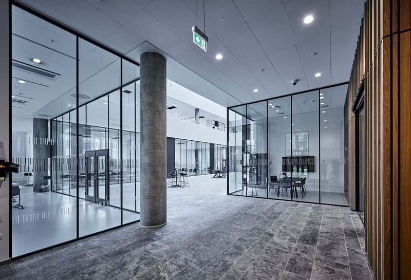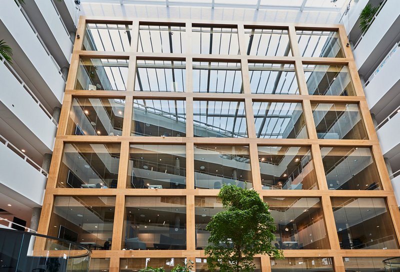 Triplan har designet og produceret alle husets glasvægge, heriblandt stueetagens 4,2 m høje lydglasvægge med sorte profiler og med døre med overblok i fuld højde. I husets atrier er der store ovenlys, og de træbeklædte vægge med store glaspartier giver en varm tone til dagslyset.