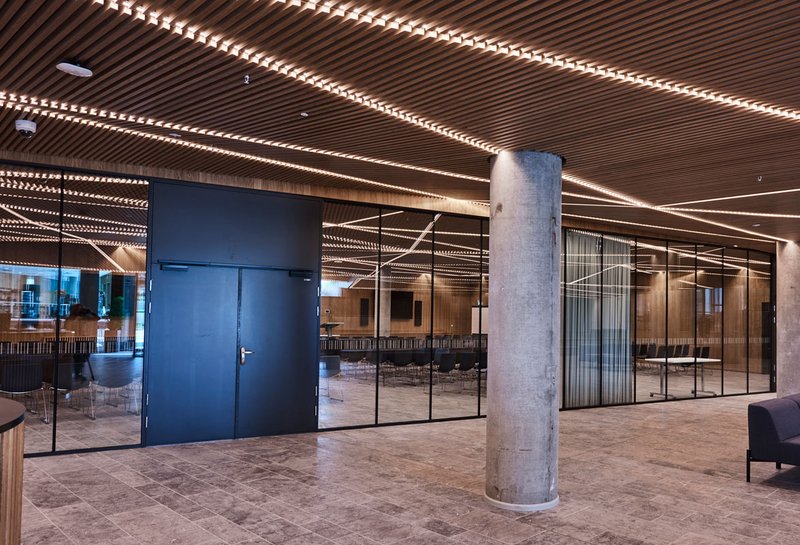 I stueetagens mødecenter er der 20 møderum i varierende størrelse med ekstra højt til loftet, det største rummer op til 250 personer.