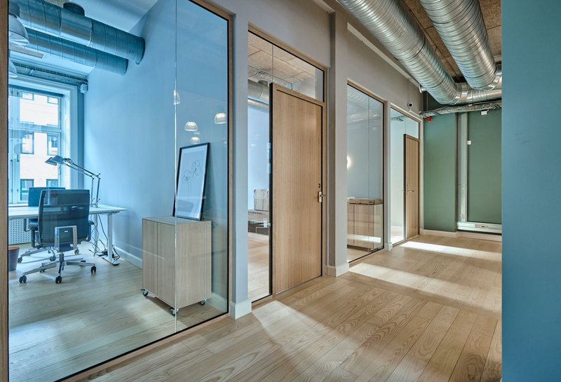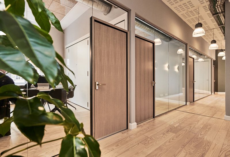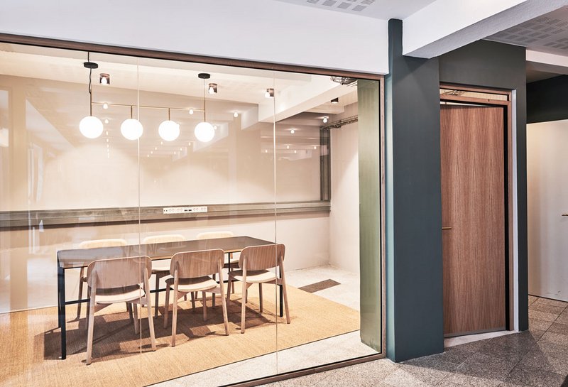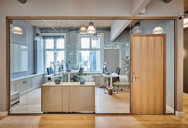 Glasvæggene er TRIPLAN LITE® | WOOD, Triplans eksklusive glasvægssystem med smalle profiler og overflade i egetræ. Glasvæggene understreger den behagelige atmosfære med  indretning i lyse træsorter og har massivdøre i egetræ.