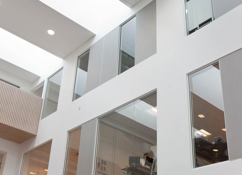 Triplan har både leveret TRIPLAN LITE® fuldglasvægge og TP Fire glasrammepartier til sundhedshuset. TRIPLAN LITE® med 2 lag glas benyttes som store lyddæmpende glasflader i atriet og som