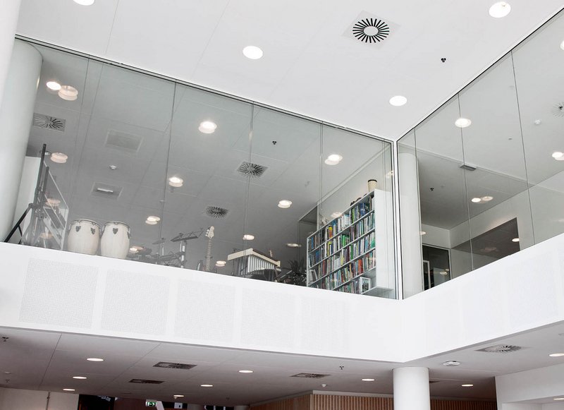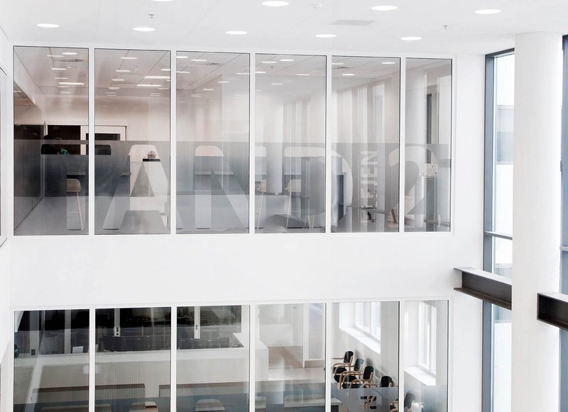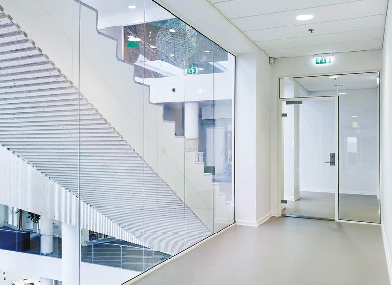 stillerum, der flittigt bruges af husets mange studerende. TRIPLAN LITE® med 1 lag glas danner næsten usynlige glasvægge mod gangarealer og trapper, og TP Fire danner en indvendig facade i indgangsområdet.