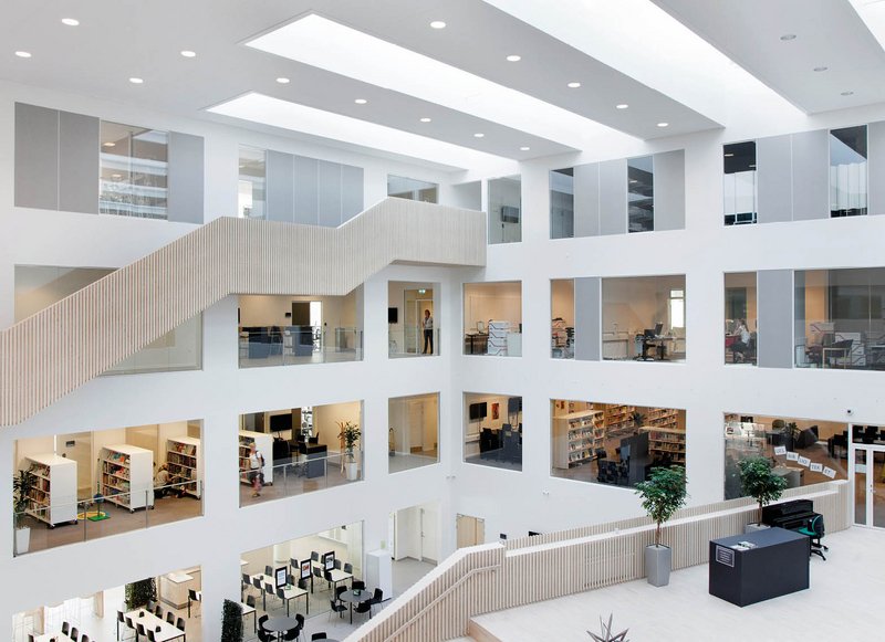 sammen af et stort lyst atrium – alt holdt i lyse og venlige materialer.