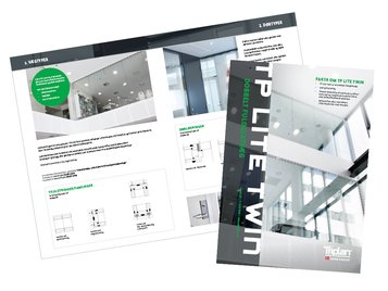 TP Lite Twin er en elegant dobbelt fuldglasvæg med slanke specialfremstillede alu-profiler i top, sider og bund. Glassene fastholdes i skinnesystemet vha. sorte tætningslister, som kan monteres uden brug af specialværktøj. Vægpartierne har en dybde på 100 mm. Glasvæggene kan nemt udbygges med flere moduler.