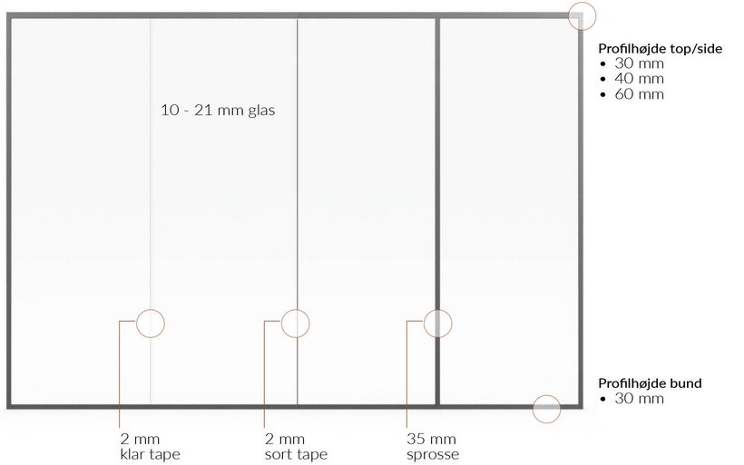 Profiler kan vælges i 30, 40 eller 60 mm´s højde. Profilernes dybde afhænger af glastykkelse. Døre leveres som 40 mm massiv trædør, glasrammedøre hvor glasset monteres udenpå rammen eller 10 mm hærdet glasdør – alle monteret i en slank T-formet karm. Døre leveres som standard M9 x 21. Kan også leveres i fuld højde og andre modulstørrelser. TRIPLAN LITE®  | 34 – 43 dB  |  ALU kan leveres med overblok, tophængte (pinolhængte) døre og med skydedøre.