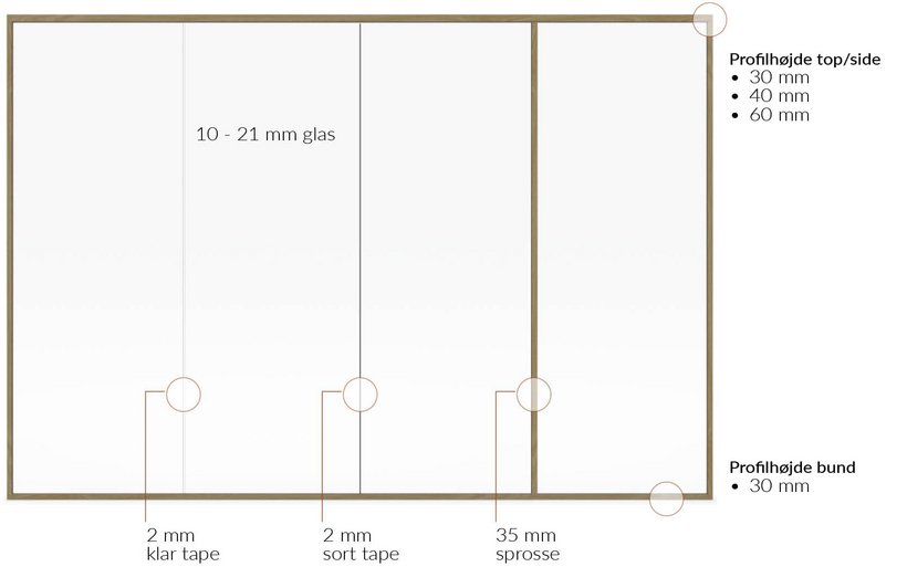 Profiler kan vælges i 30, 40 eller 60 mm´s højde. Profilernes dybde afhænger af glastykkelse. Døre leveres som 40 mm massiv trædør, glasrammedøre hvor glasset monteres udenpå rammen eller 10 mm hærdet glasdør – alle med T-karm med overflade i egetræ. Døre leveres som standard M9 x 21. Kan også leveres i fuld højde og andre modulstørrelser. TRIPLAN LITE®  | 34 – 43 dB  |  WOOD kan leveres med overblok, tophængte (pinolhængte) døre og med skydedøre.